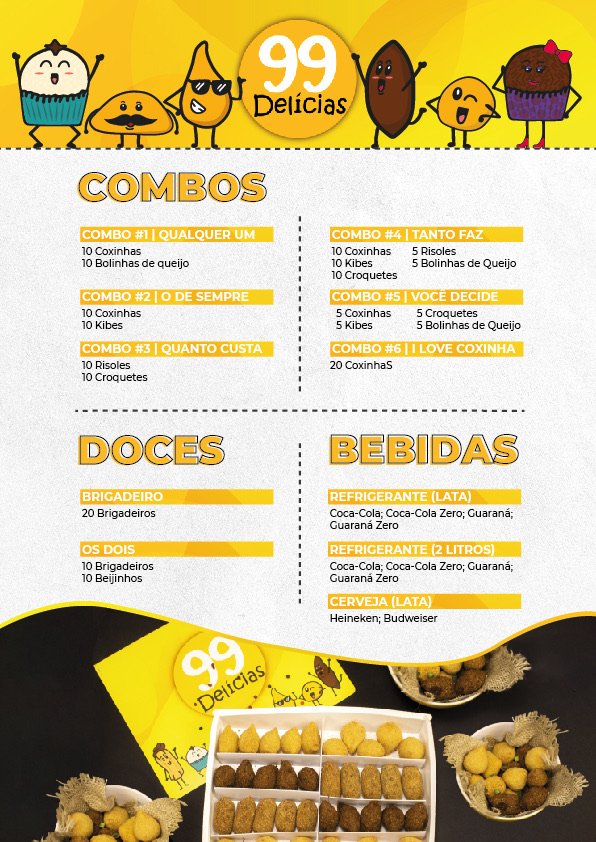 Venha buscar seus deliciosos quitutes na 99 Delícias, ou peça pelo delivery.